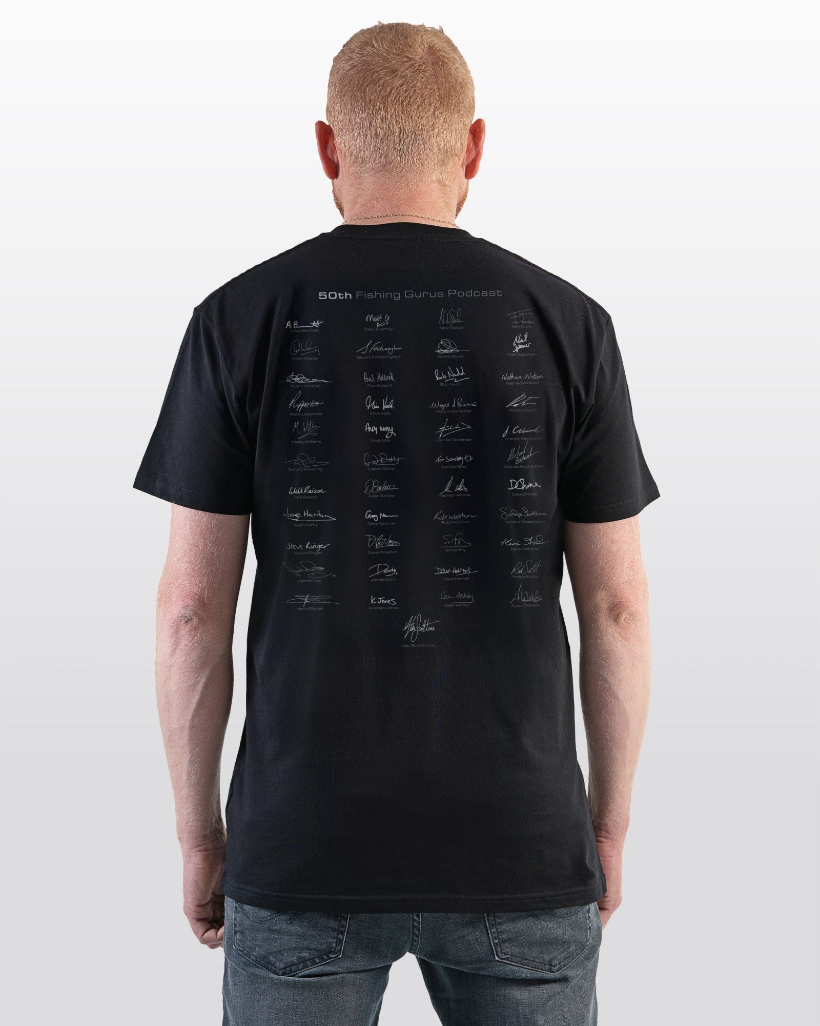 The 50th Podcast Tee features the Fishing Gurus Podcast Logo on the front offering a subtle yet distinctive nod to the podcast. The rear of the tee showcases the signatures of all fifty guests who have been part of the podcast so far. These names include Steve Ringer, Andy Bennett, Will Raison, Andy May and Adam Rooney to name just a few.